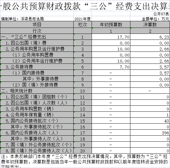 “三公”经费支出:指用一般公共预算财政拨款安排的因公出国(境)费、公务用车购置及运行维护费和公务接待费。其中,因公出国(境)费反映单位公务出国(境)的国际旅费、国外城市间交通费、住宿费、伙食费、培训费、公杂费等支出;公务用车购置及运行维护费反映单位公务用车车辆购置支出(含车辆购置税、牌照费),按规定保留的公务用车燃料费、维修费、过桥过路费、保险费、安全奖励费用等支出;公务接待费反映单位按规定开支的各类公务接待(含外宾接待)支出。