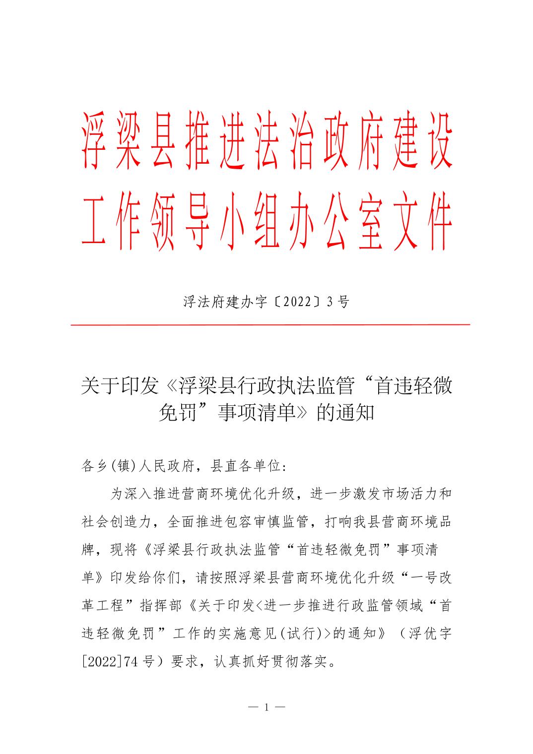 为深入推进营商环境优化升级,进一步激发市场活力和社会创造力,全面推进包容审慎监管,打响我县营商环境品牌,现将《浮梁县行政执法监管“首违轻微免罚”事项清单》公开如下