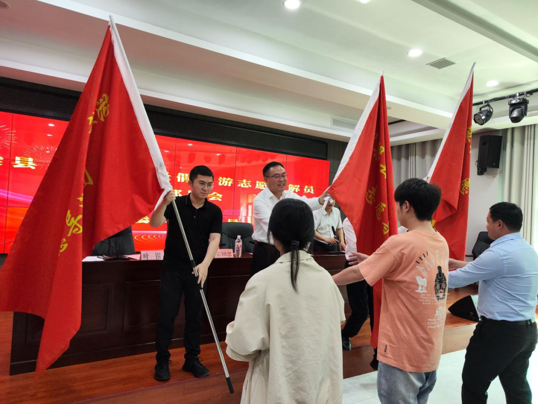 会上,县文广新旅局、县团委领导对三个景区志愿讲解员队伍进行了授旗,希望在大家的共同努力下,圆满完成这次假期景区志愿解说工作任务,为游客们留下美好的浮梁记忆。