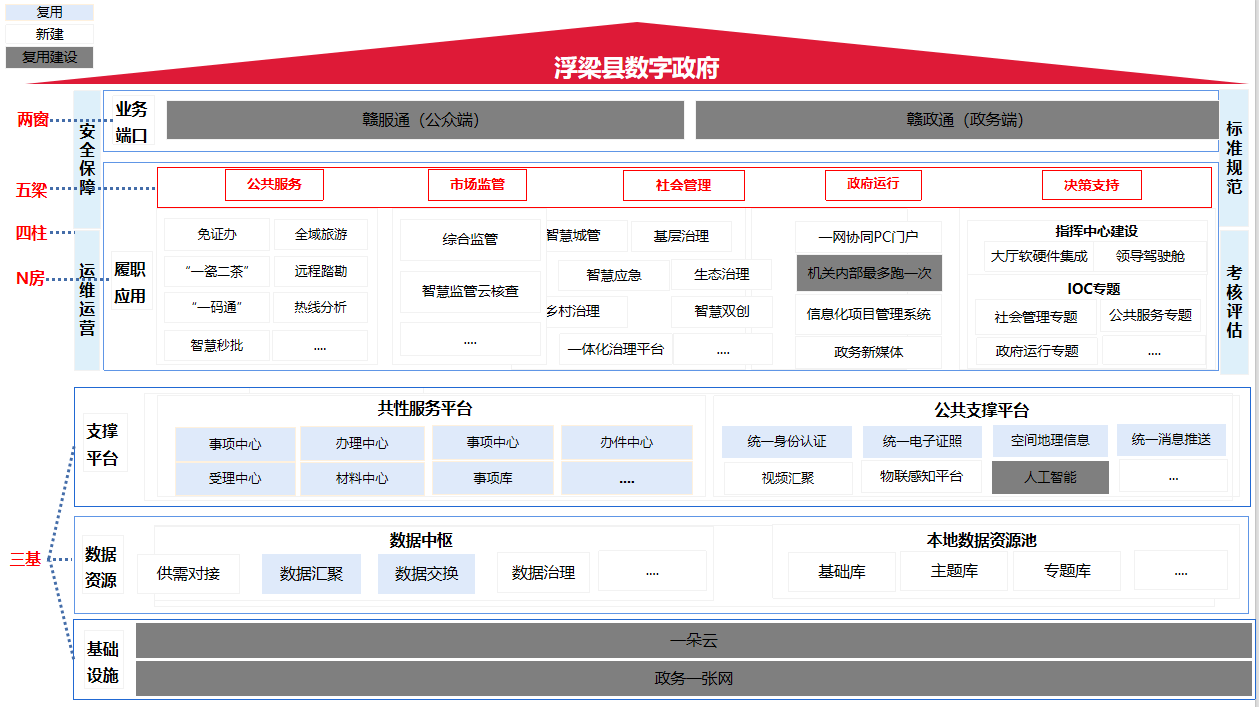 3.支撑平台。基于省市统建的公共支撑能力,拓展符合浮梁县实际需求、具有浮梁县域特色的应用。