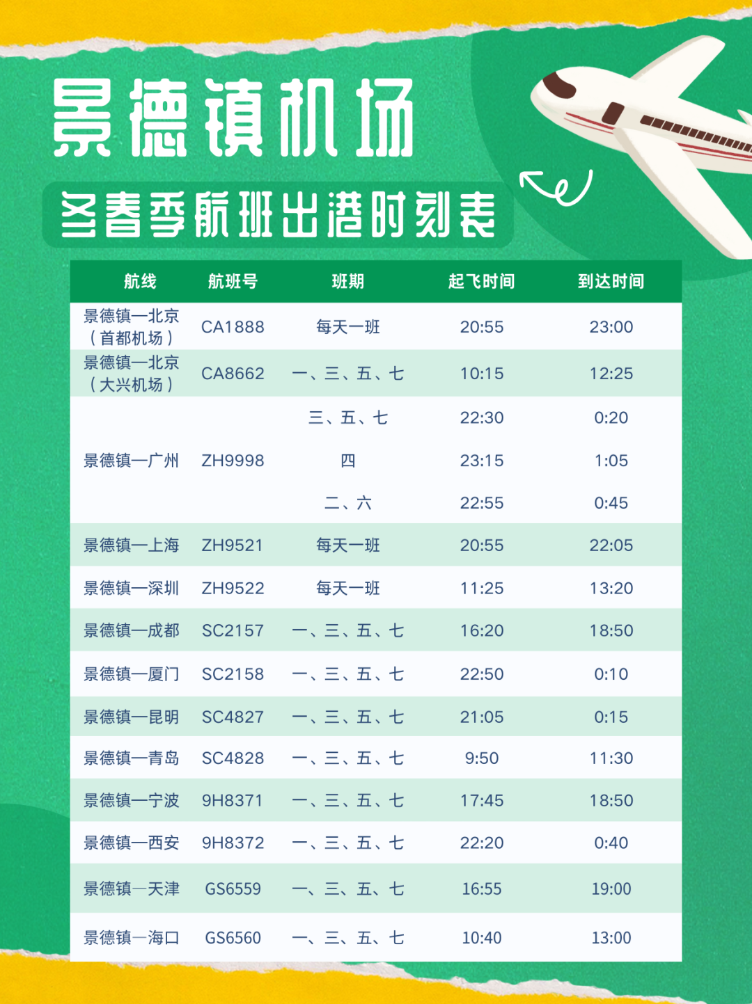 景德镇机场执行冬春航季时间
