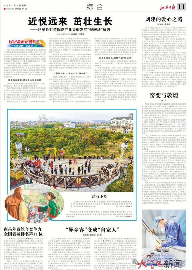 梯次培育,助力企业“登高望远”。浮梁构建起覆盖陶瓷企业全生命周期的梯次培育体系。无论是推动小微企业“升规入统”,还是助力骨干企业争创专精特新等,均有专人指导、政策倾斜。今年,景德镇景华特种陶瓷有限公司等2家企业通过2025年江西省专精特新中小企业复核,金意陶获批2025年第一批次省级“小灯塔”企业……精准的培育策略,正推动浮梁陶瓷企业梯队不断壮大、能级持续提升。