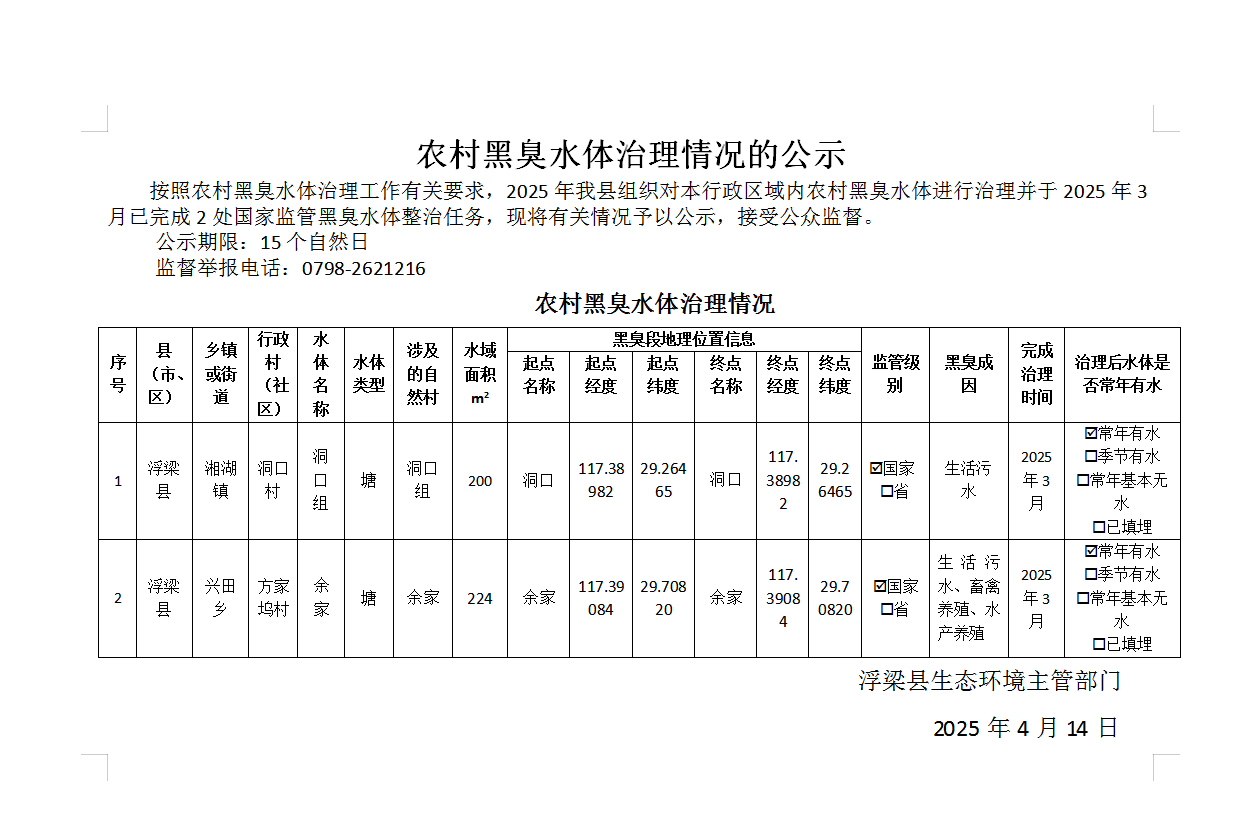 农村黑臭水体治理情况的公示
