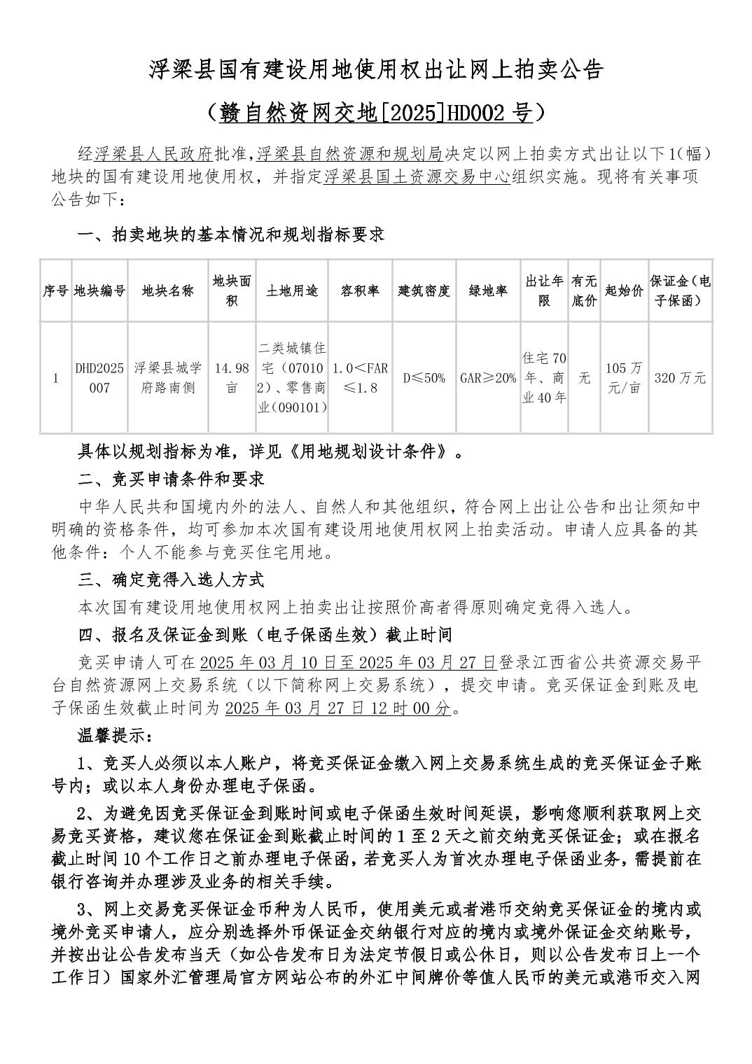 浮梁县国有建设用地使用权出让网上拍卖公告