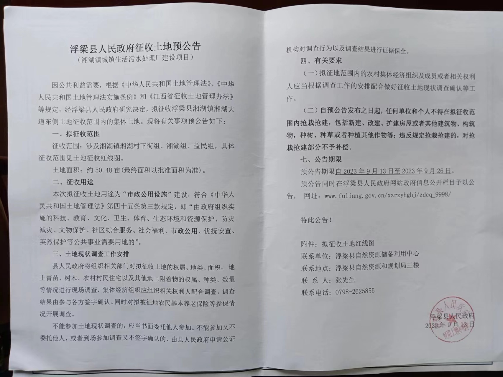 浮梁县人民政府征收土地预公告 (湘湖镇城镇生活污水处理厂建设项目)