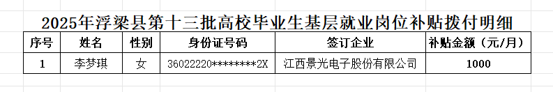 根据《江西省人力资源和社会保障厅江西省工业和信息化厅 江西省财政厅关于做好高校毕业生基层就业岗位补贴工作的通知》(赣人社字[2025]108号)文件要求,经审核,截至目前1人符合2025年度高校毕业生基层岗位补贴条件,现将人员名单予以公示,接受社会监督,公示期间如有异议,请向浮梁县就业创业服务中心反映。