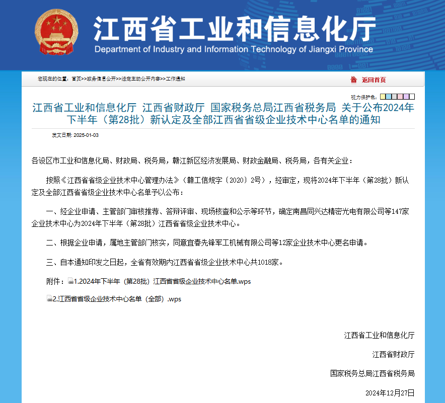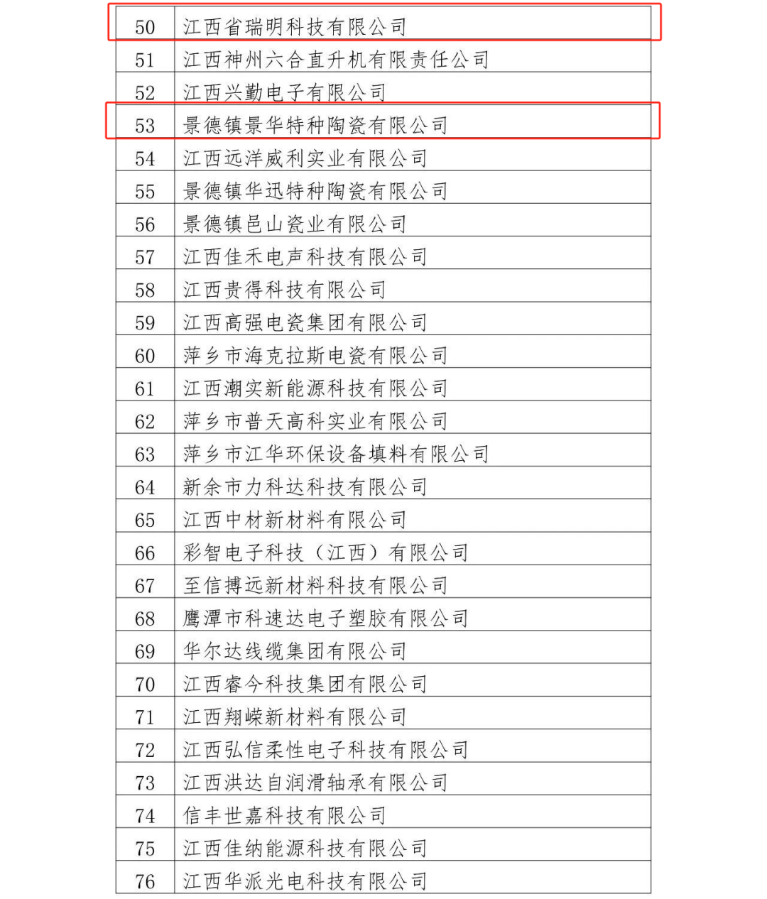 近日,江西省工业和信息化厅、江西省财政厅以及国家税务总局江西省税务局联合发布了《关于公布2024年下半年(第28批)新认定及全部江西省省级企业技术中心名单的通知》,我县江西省瑞明科技有限公司、景德镇景华特种陶瓷有限公司两家企业正式被认定为江西省省级企业技术中心。