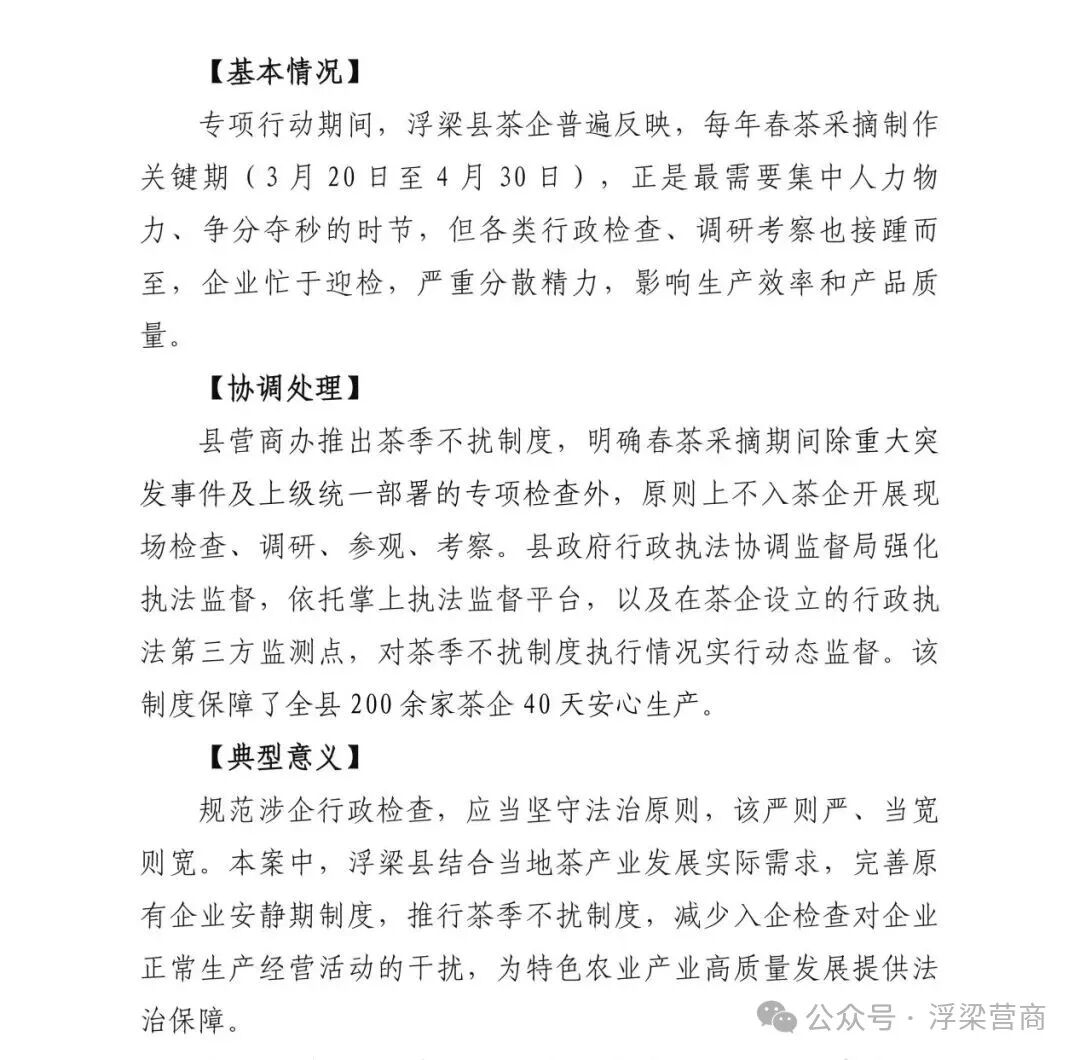 近日,浮梁县“茶季不扰”制度成功入选全省《规范涉企行政执法专项行动为民办实事典型案例》。