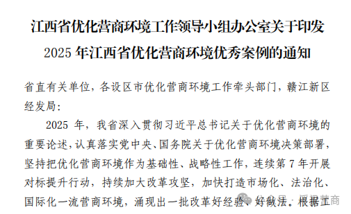近期,江西省优化营商环境工作领导小组公布了“2025年度江西省优化营商环境优秀案例”,共评选出市场环境类、法治环境类、开放环境类、政务环境类、人文创新类等5大类40个优秀案例。我县《构建先进陶瓷全链条服务新生态 培育百亿级新质生产力集群》案例成功入选政务环境类优秀案例,实现全省优化营商环境优秀案例连续三年入选。