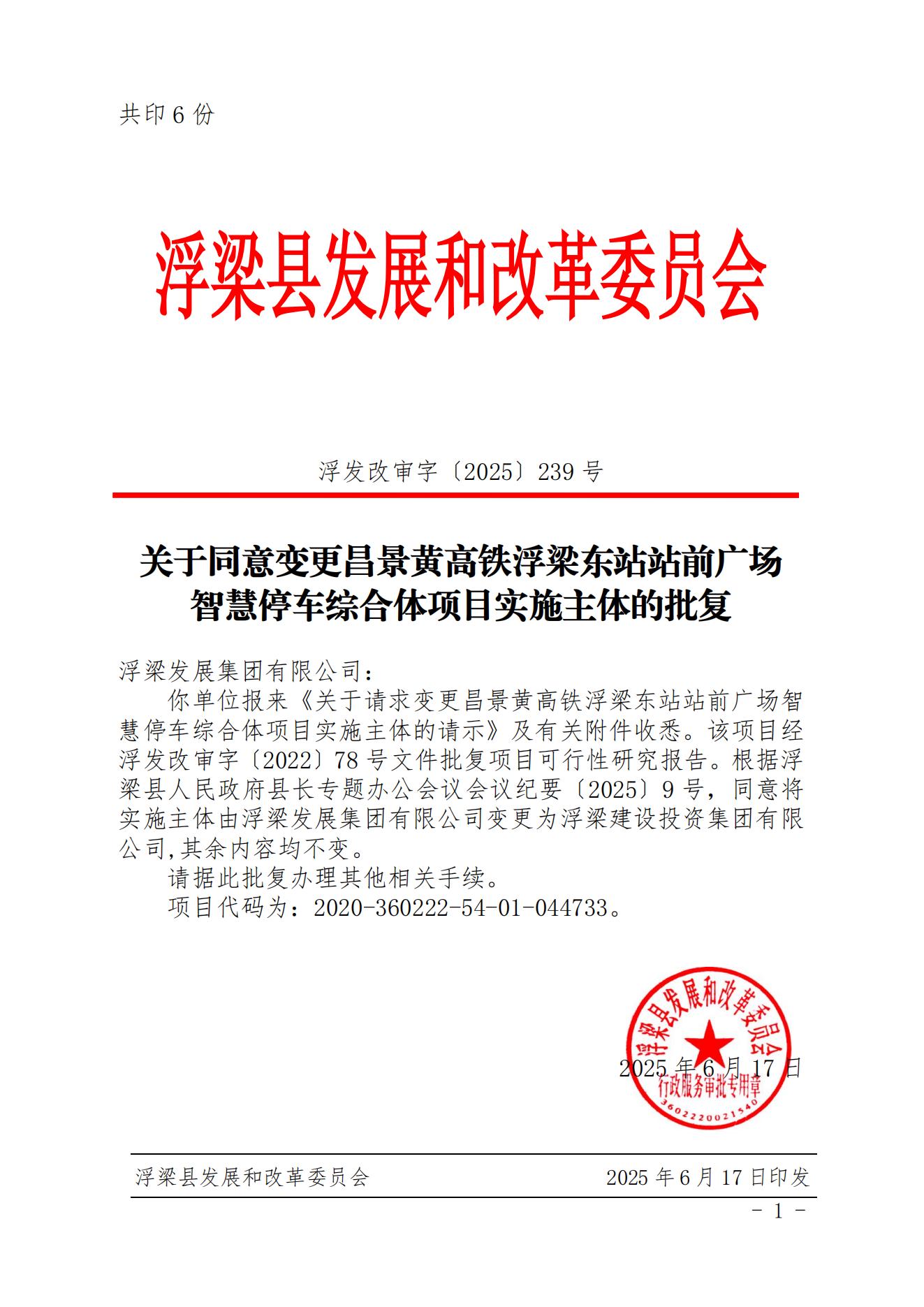 关于同意变更昌景黄高铁浮梁东站站前广场 智慧停车综合体项目实施主体的批复