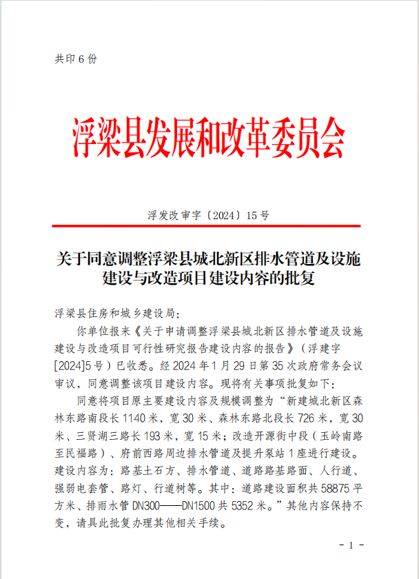 关于同意浮梁县城北新区排水管道及设施 建设与改造项目可行性研究 报告的批复(155号)