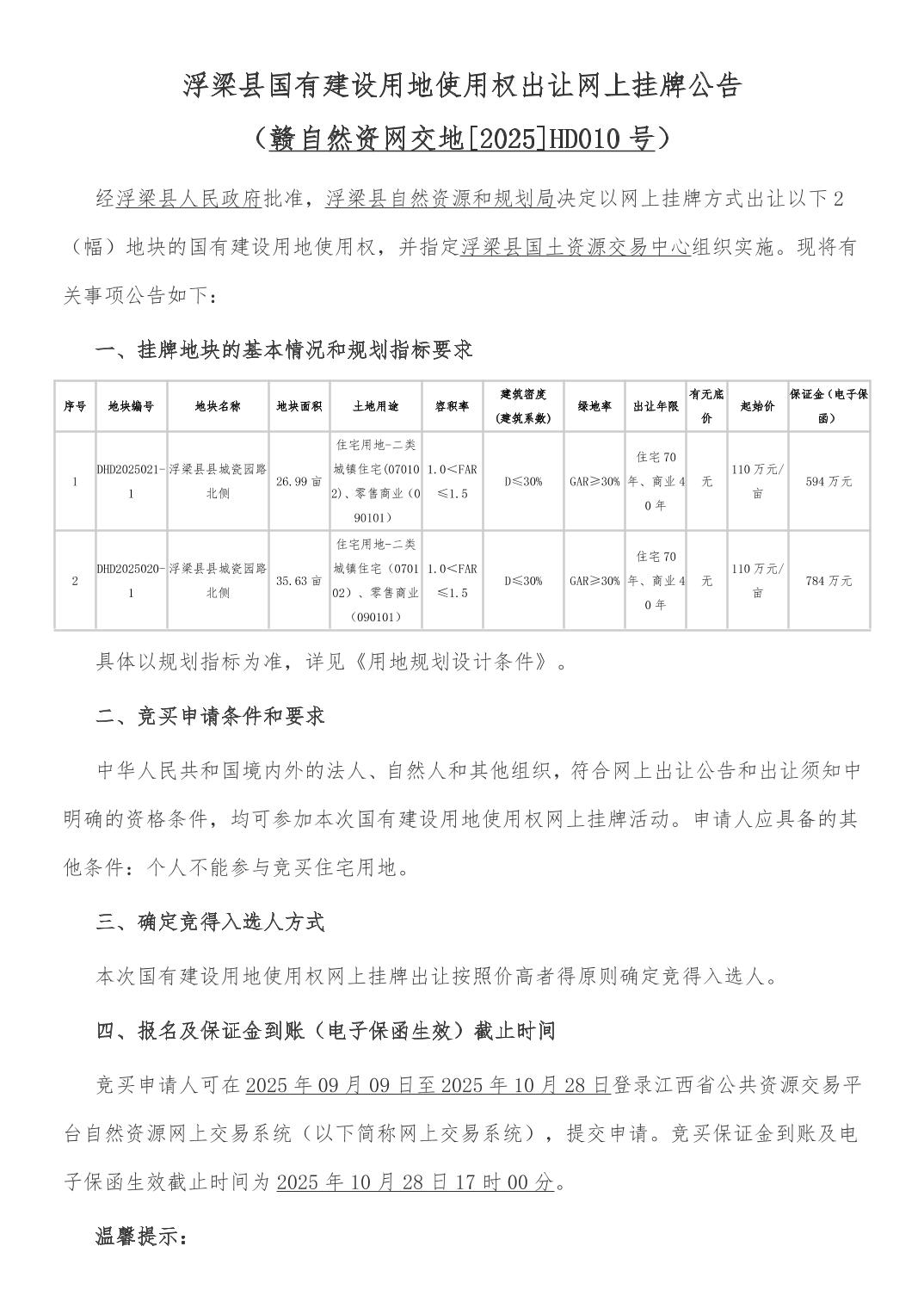 浮梁县国有建设用地使用权出让网上挂牌公告