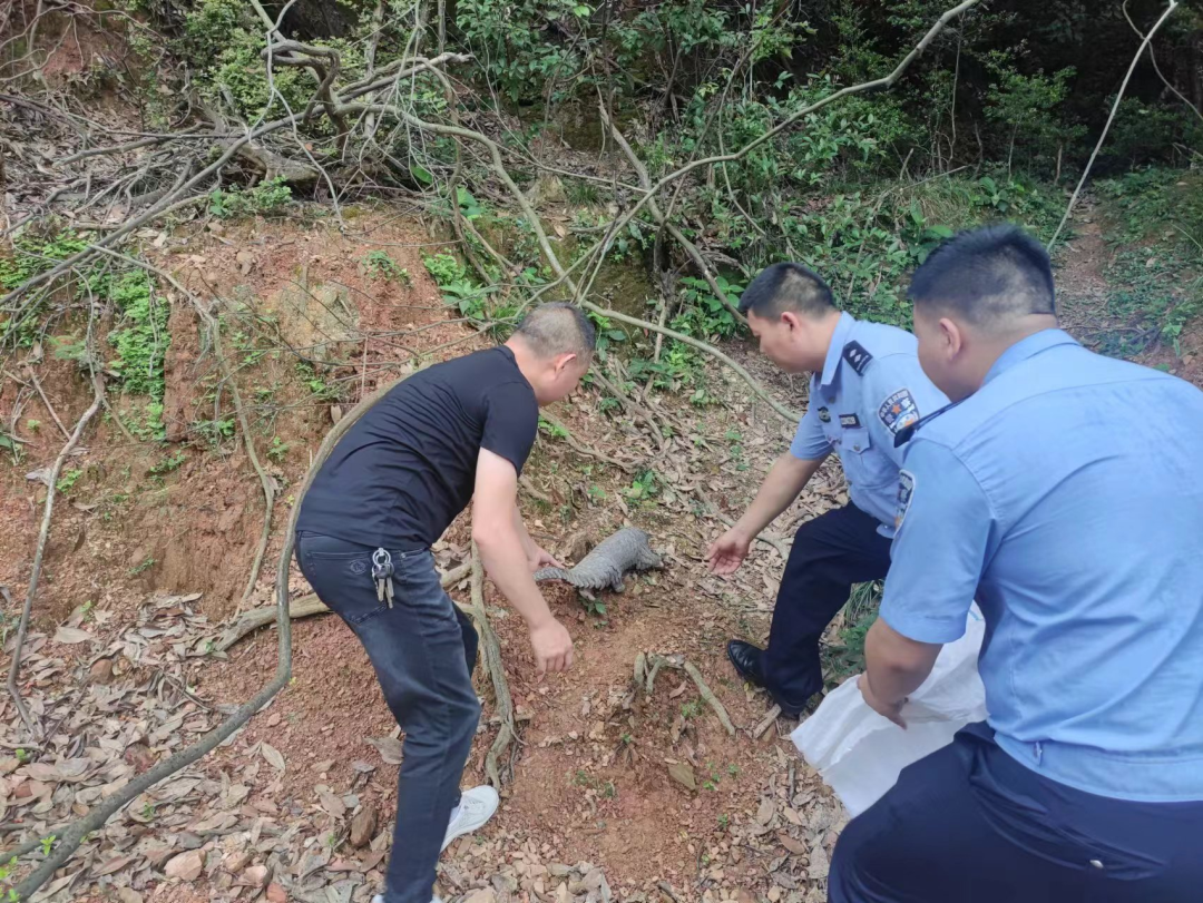 6月17日,三龙镇杨家村麦园里组村民段青,在乐华陶瓷洁具厂内发现一只国家一级保护动物——中华穿山甲,随后拨打报警电话。县公安局三龙派出所和三龙镇林业工作站的工作人员,立即赶到现场处置。经林业工作站的人员检查,这只成年的中华穿山甲无明显外伤,精神状态良好,性情较为活泼,身长77厘米,体重7斤左右,于次日上午在三龙镇杨家村乐华陶瓷洁具厂后山放生。中华穿山甲是稀有珍贵的物种,其视觉基本退化、嗅觉灵敏,主要栖息于丘陵、山麓、平原的树林潮湿地带,主要以白蚁、蜜蜂等为食,有“森林卫士”之称,是国家一级保护动物。