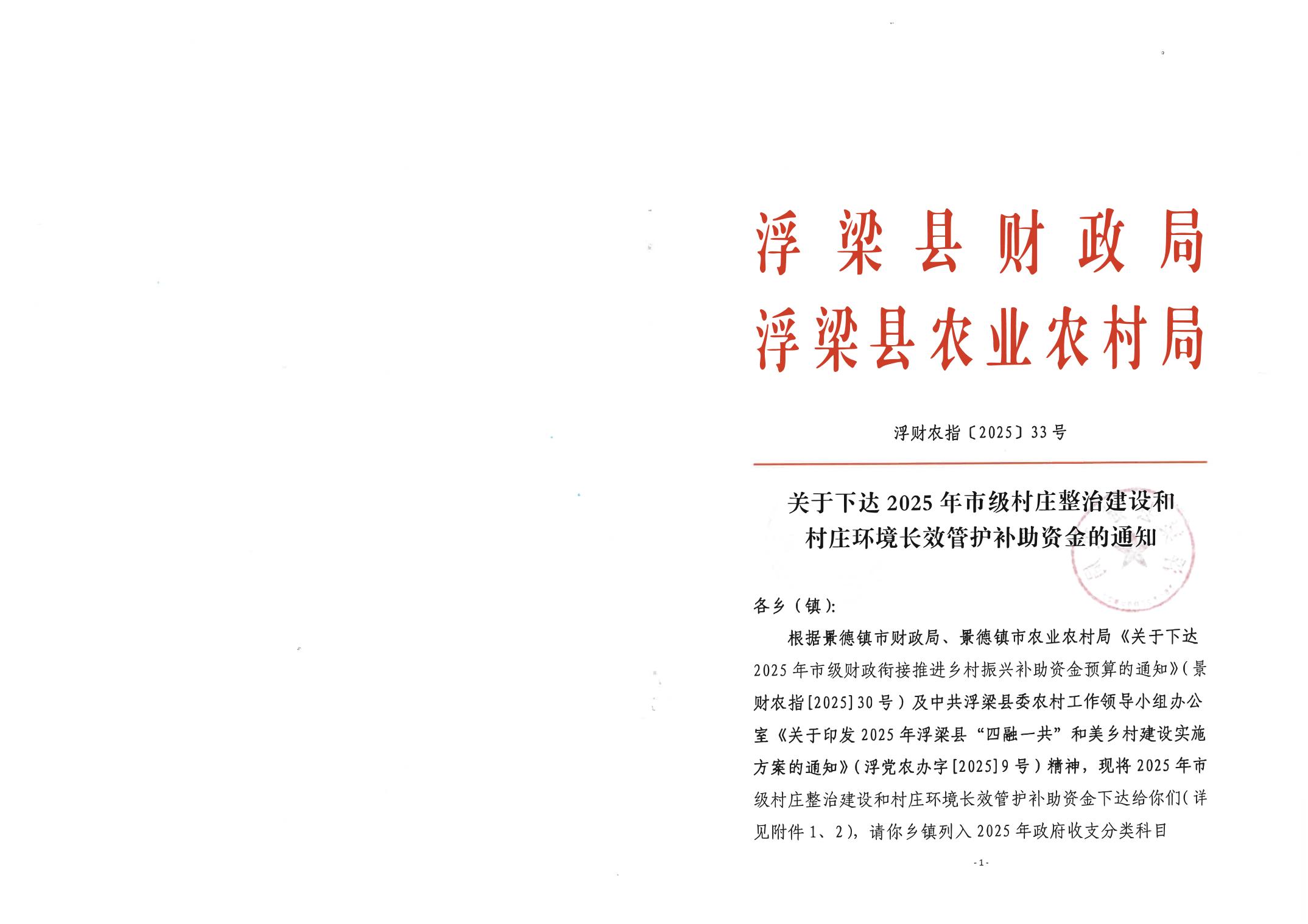 浮财农指【2025】33《关于下达2025年市级村庄整治建设和村庄环境长效管护补助资金的通知》