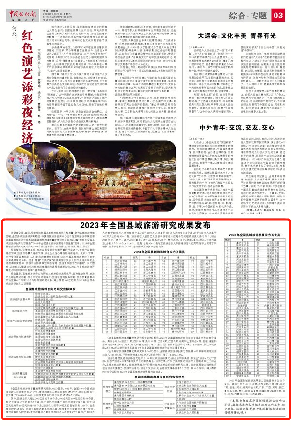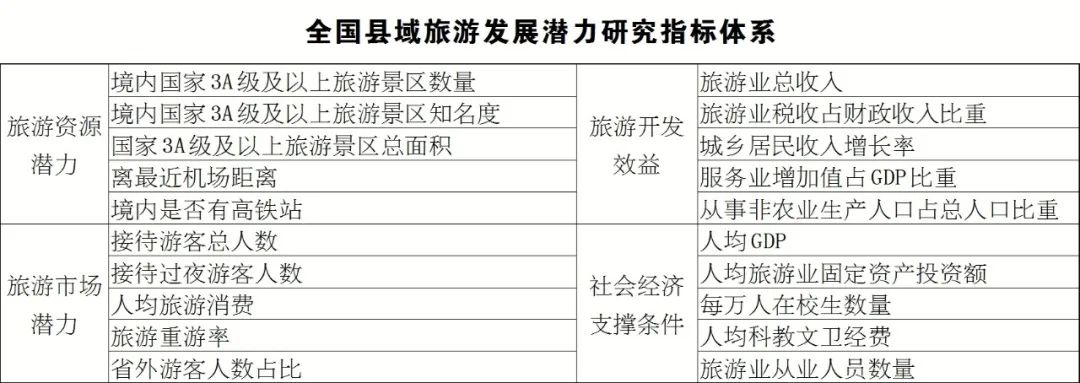 备注:旅游发展潜力评价是对城市旅游业系统的分析和总结。旅游发展潜力指标体系包含旅游资源潜力、旅游市场潜力、旅游开发效益、社会经济支撑条件等5个方面,共20个指标。得分靠前的100个县即为2023年全国县域旅游发展潜力百佳县。