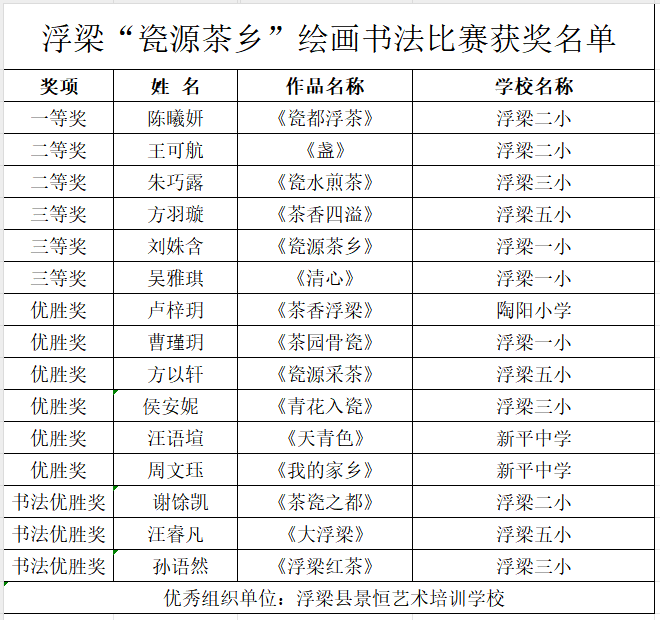 近日,由县图书馆主办的浮梁“瓷源茶乡”绘画书法作品比赛落下帷幕,一批来自我县中小学生的优秀作品获奖。