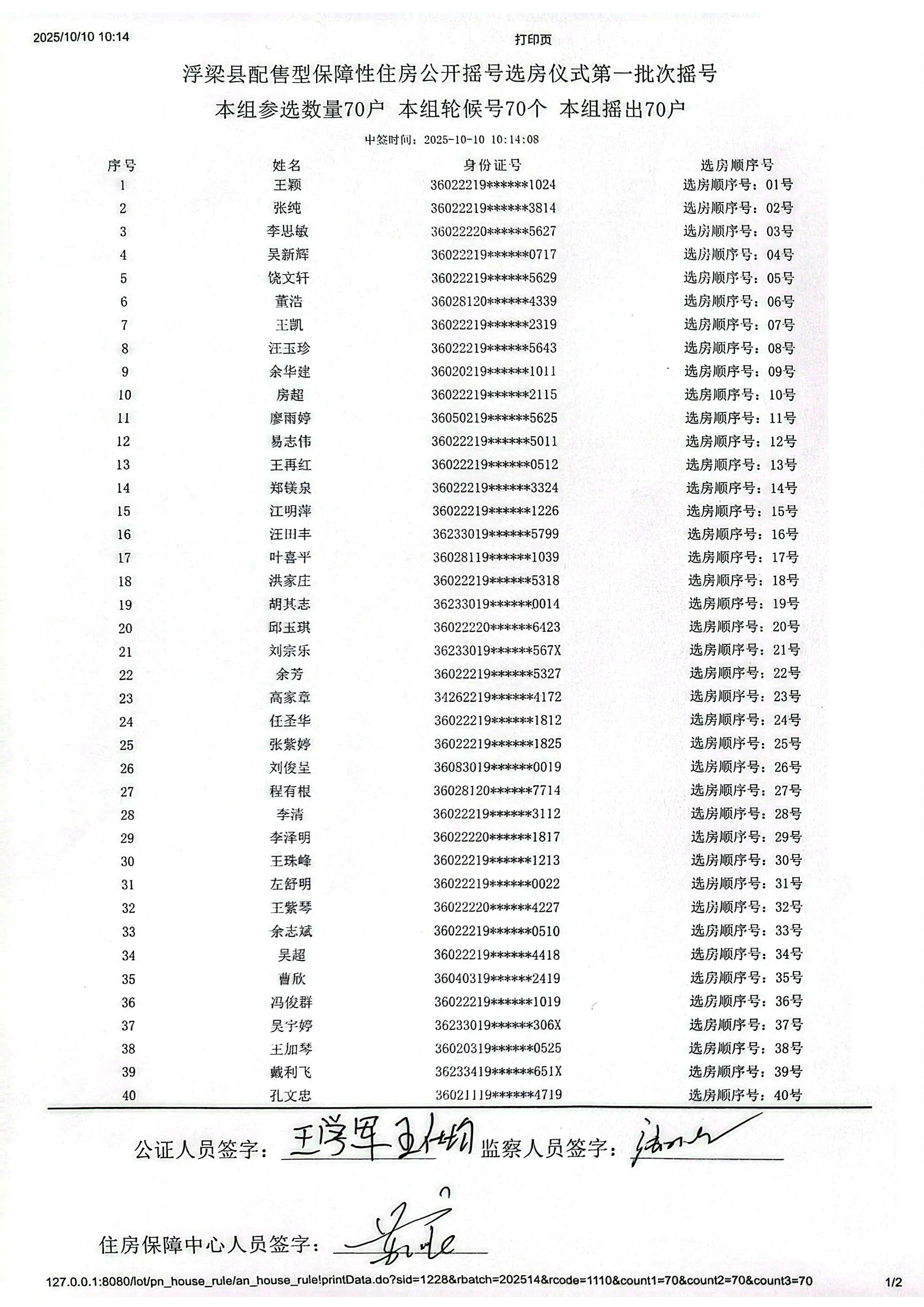 根据《浮梁县收购已建成存量商品房用作保障性住房工作方案》《浮梁县配售型保障性住房建设和管理实施办法》《浮梁县配售型保障性住房第一批次配售摇号方案》,浮梁县配售型保障性住房第一批次配售公开摇号于2025年10月10日上午在浮梁体育中心负一楼报告厅举行,现将摇号结果公告如下: