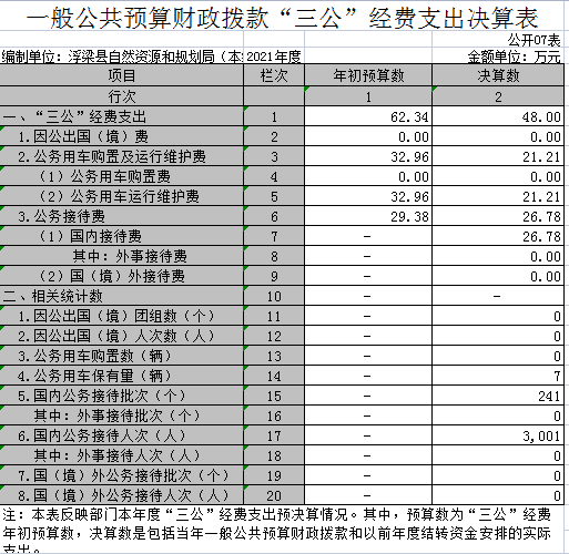 “三公”经费支出:指用一般公共预算财政拨款安排的因公出国(境)费、公务用车购置及运行维护费和公务接待费。其中,因公出国(境)费反映单位公务出国(境)的国际旅费、国外城市间交通费、住宿费、伙食费、培训费、公杂费等支出;公务用车购置及运行维护费反映单位公务用车车辆购置支出(含车辆购置税、牌照费),按规定保留的公务用车燃料费、维修费、过桥过路费、保险费、安全奖励费用等支出;公务接待费反映单位按规定开支的各类公务接待(含外宾接待)支出。