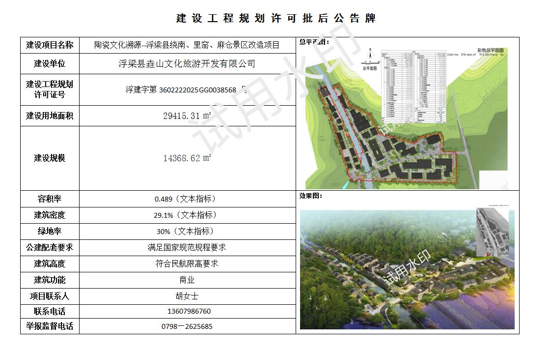 建设工程规划许可批后公告牌(陶瓷文化溯源--浮梁县绕南、里窑、麻仓景区改造项目)