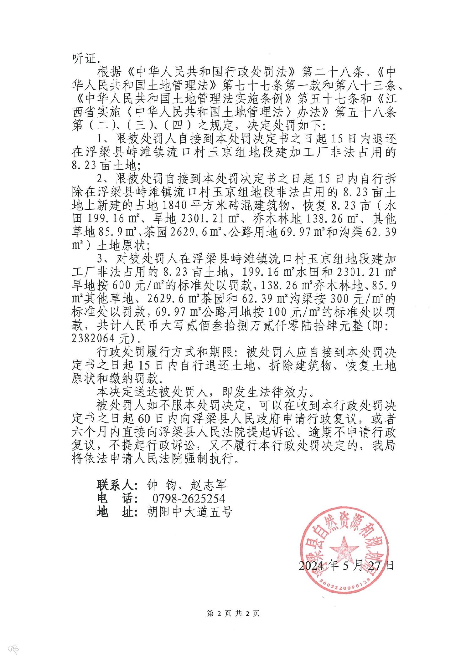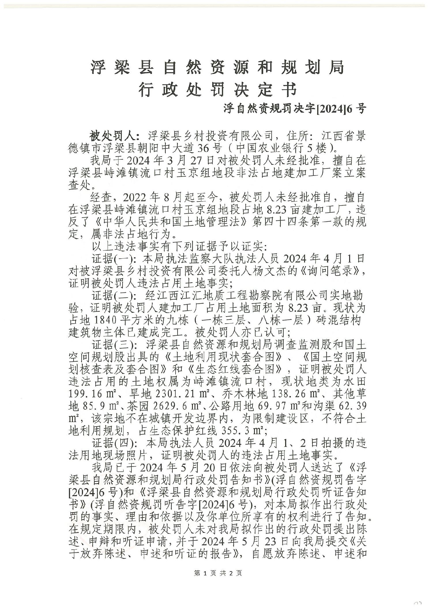浮梁县自然资源和规划局行政处罚决定书 浮自然资规罚决字【2024】6号