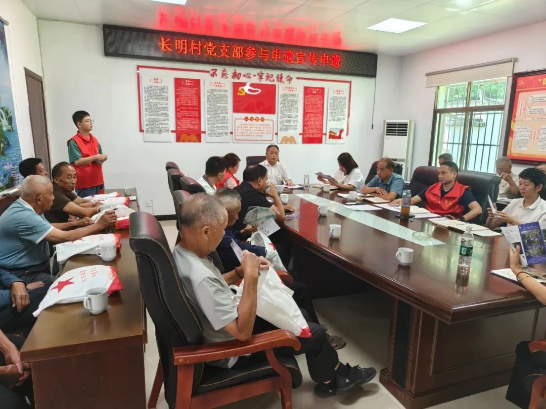 活动现场,志愿服务队员向党员干部发放了申遗宣传折页,以生动形象、通俗易懂的语言,深入浅出地讲解遗产背后的历史脉络与保护传承的重大意义,让申遗理念如春风化雨般浸润人心。长明村党支部书记黄海发同志结合本地实际,围绕申遗项目、工作进展、文化遗产保护措施等内容进行了详细讲解,并着重介绍了长明村所在的长岭瓷石矿遗址。他指出,该遗址见证了瓷石和釉果大规模开采加工的历史,反映了瓷业长期延续、深厚积累的历史层积过程。黄海发同志号召全体党员发挥先锋模范作用,带头当好申遗工作的“宣传员”、“战斗员”和“服务员”,积极投身申遗实践。
