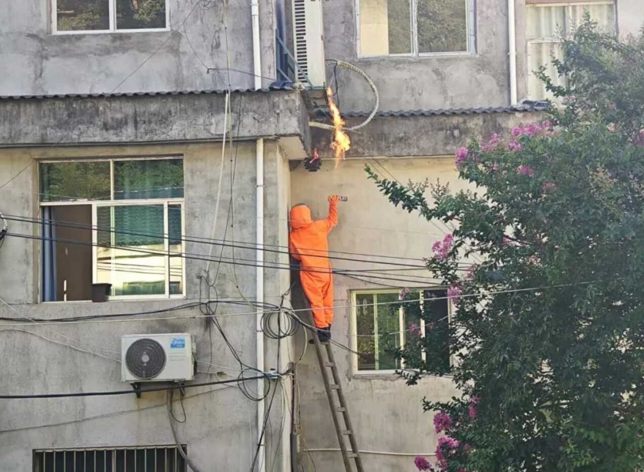 抵达现场后,突击队首先对马蜂窝的具体位置进行细致勘查,结合实际情况制定了科学的处置方案。针对该蜂窝的位置特点,队员们灵活采用袋装移除、药剂喷洒及火攻等方法,对马蜂窝展开彻底清除。作业过程中,队员们严格遵守操作规程,全程佩戴齐全安全防护装备,同步设立安全警戒区并有效疏散周边群众,确保整个操作过程安全无虞。