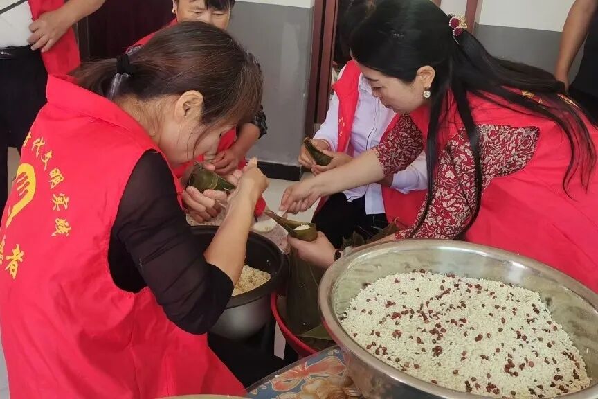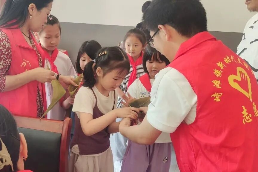 活动开始,志愿者先为小朋友们讲述了端午节的由来和习俗,从屈原的爱国故事到挂艾草、赛龙舟、吃粽子等传统习俗,生动有趣的讲解让小朋友们听得津津有味,对端午节有了更深入的了解。在包粽子环节,志愿者提前备好了糯米、粽叶、黄豆等材料,并邀请村里的“包粽能手”现场教学。折叶、填米、放馅、捆扎……叔叔阿姨们手法娴熟,孩子们则跃跃欲试。在志愿者的耐心指导下,孩子们从手忙脚乱到逐渐掌握技巧,包出了形态各异的粽子,活动现场粽香四溢,欢声笑语不断。