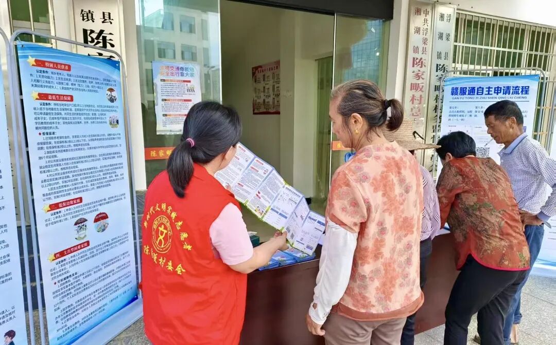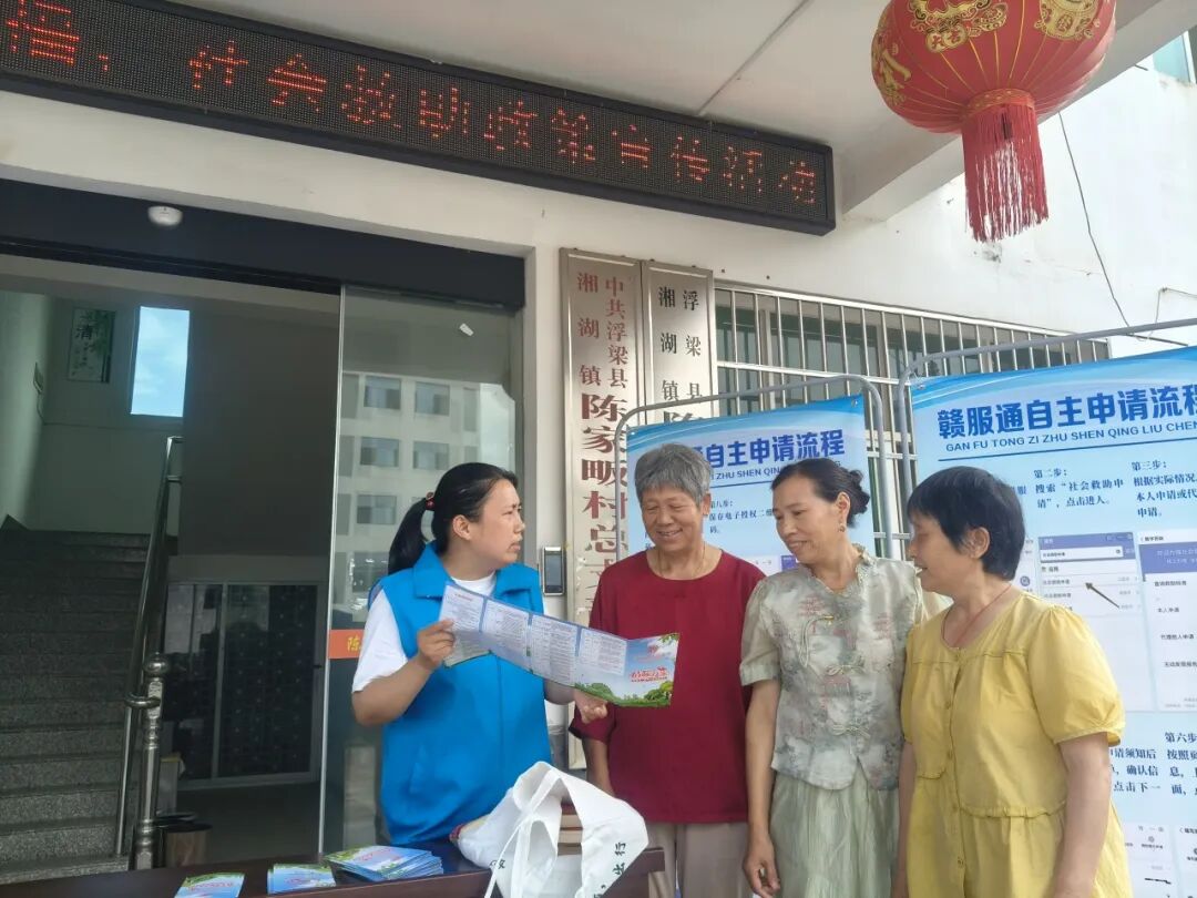 “大叔,您家如果有因病致贫的情况,可以申请临时救助,我给您讲讲具体流程……”活动现场,志愿者们在村委会门口设立政策咨询阵地,向过往群众发放《浮梁县社会救助服务指南》等宣传资料,并详细解读特困人员供养、最低生活保障、低保边缘家庭、临时救助等政策的申请条件、办理流程及救助标准。针对“如何申请低保”“特困人员的保障措施有哪些”“大病救助能报多少”等高频咨询问题,志愿者结合实例一一解答,用“方言+图解”的形式解读申请条件、流程和补助标准,将条文转化为听得懂、算得清的实在话,帮助群众直观理解政策“兜底”作用。