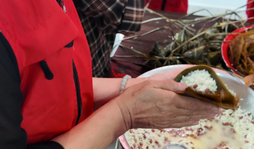 活动现场,志愿者们早早准备好了糯米、红豆、肉馅、粽叶、棉线等包粽子的材料,摆放在桌上。上午九点半,大家围在一起,纷纷露出看家本领,捋粽叶、做漏斗状、填糯米、压紧实、封口、扎捆,巧手翻飞,不一会儿工夫,一只只各式各样的漂亮粽子瞬间成型。三角形、长条形……大家一边包粽子,一边唠家常,现场欢声笑语不断,洋溢着浓浓的节日氛围。