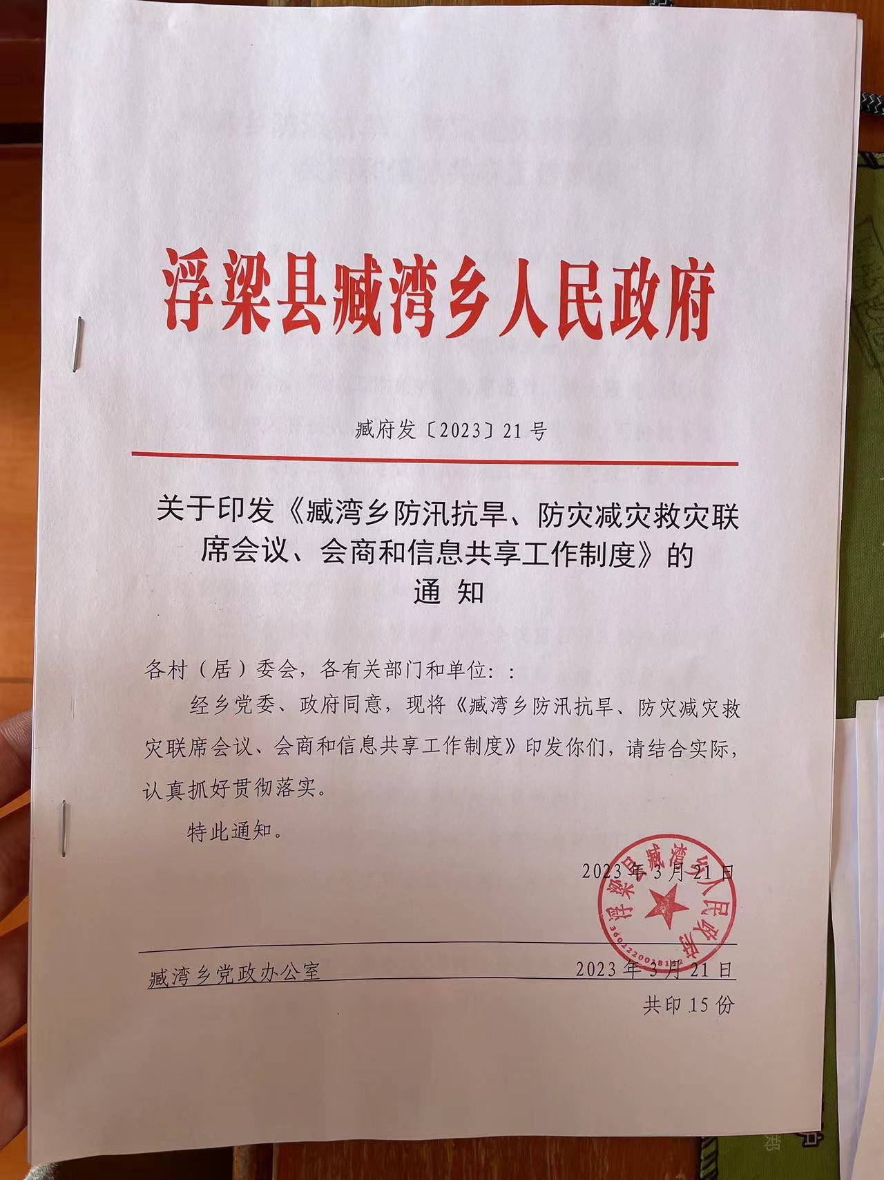 关于印发《臧湾乡防汛抗旱、防灾减灾救灾联席会议、会商和信息共享工作制度》的 通 知