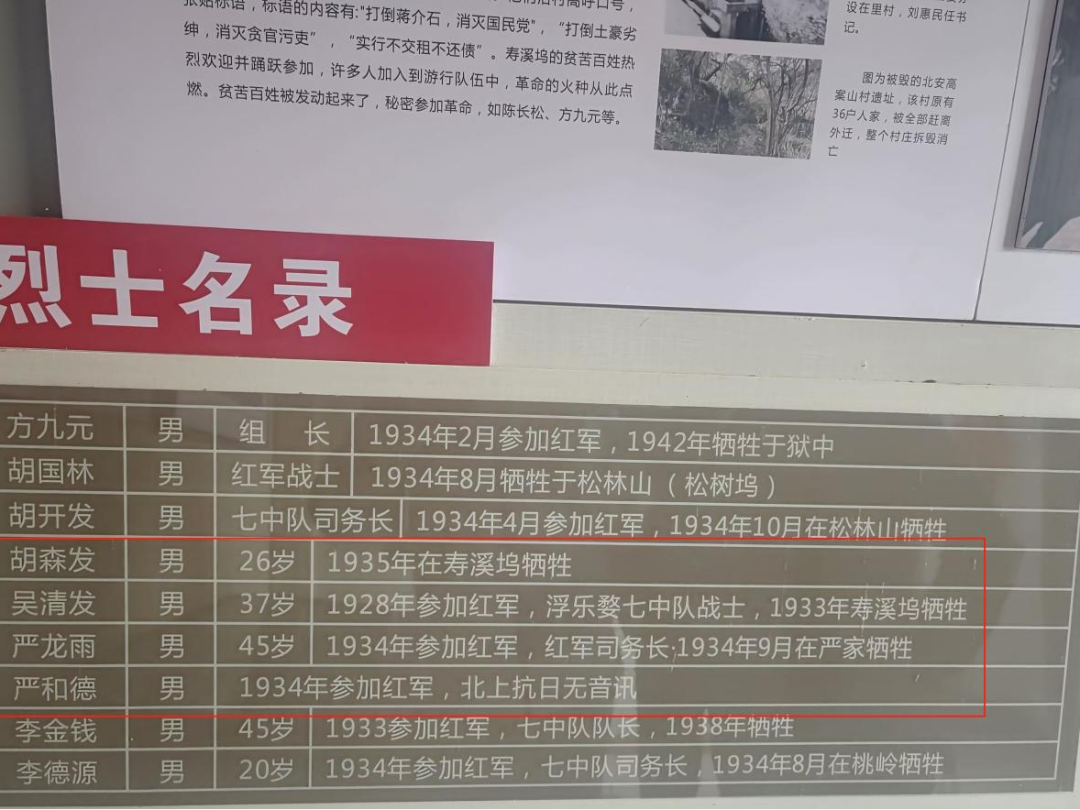 经走访了解到,1934年9月,皖赣边苏区在敌人进攻中失陷,许多苏区干部、红军战士、红军家属遇害,严龙雨等7位浮乐婺七中队红军战士也被捕,敌人将他们集体杀害于寿溪严村。