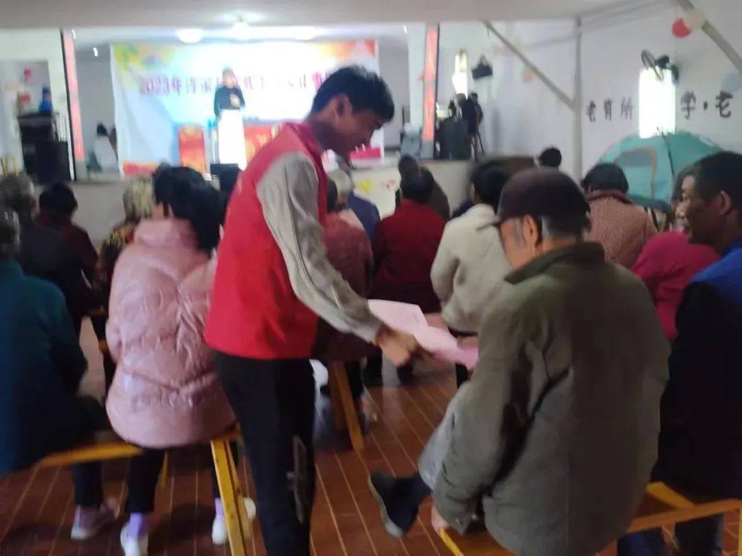 演出开始前,村民早早地聚集在新时代文明实践站,等待节目开始。志愿者们帮忙摆放座椅和维护现场秩序,并且发放移风易俗、双提升、养老诈骗宣传单。